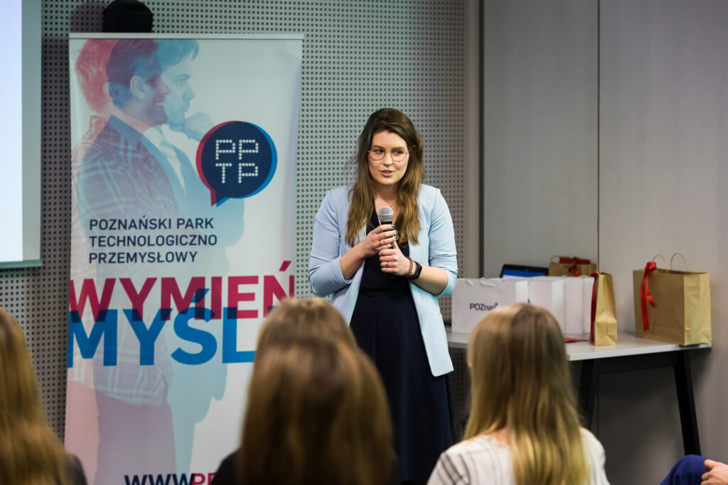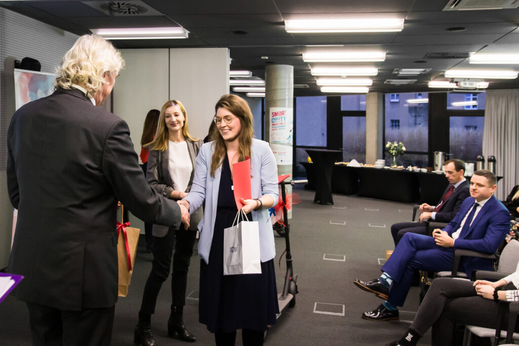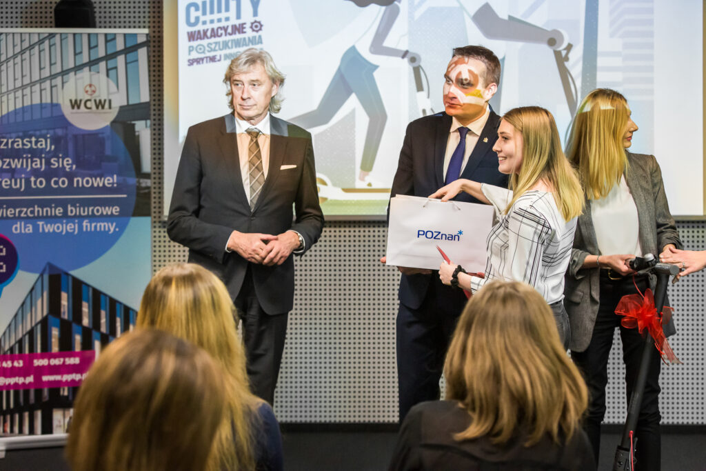 Po krótkim podsumowaniu konkursu Laureatki, studentki poznańskich uczelni miały okazję osobiście przedstawić swoje pomysły. Inteligentny system informacji parkingowej, hotele kapsułowe czy aplikacja usprawniająca funkcjonowanie transportu miejskiego to to część rozwiązań, które zostały nagrodzone w konkursie. Laureatki konkursu otrzymały nagrody rzeczowe, tj. laptopy, smartfony i elektryczne hulajnogi, które sponsorowali WCWI oraz Fundacja Komputronik.